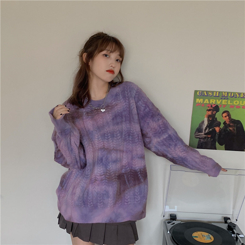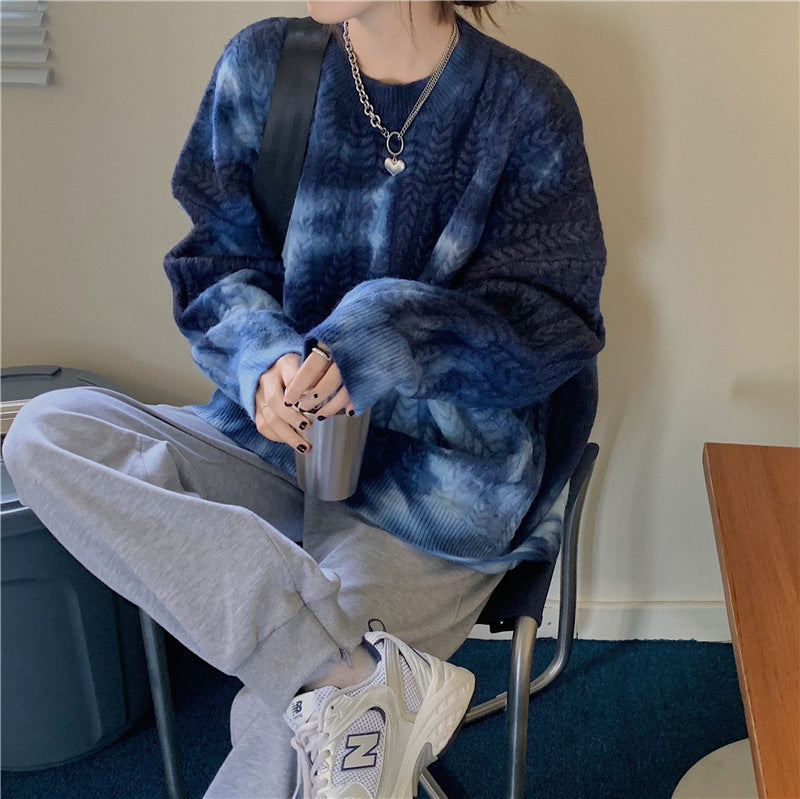 ラウンドネック ケーブル模様 絞り染め 長袖 セーター